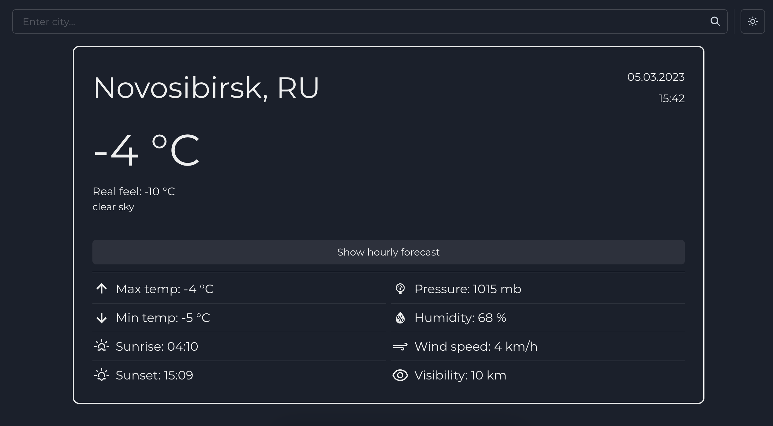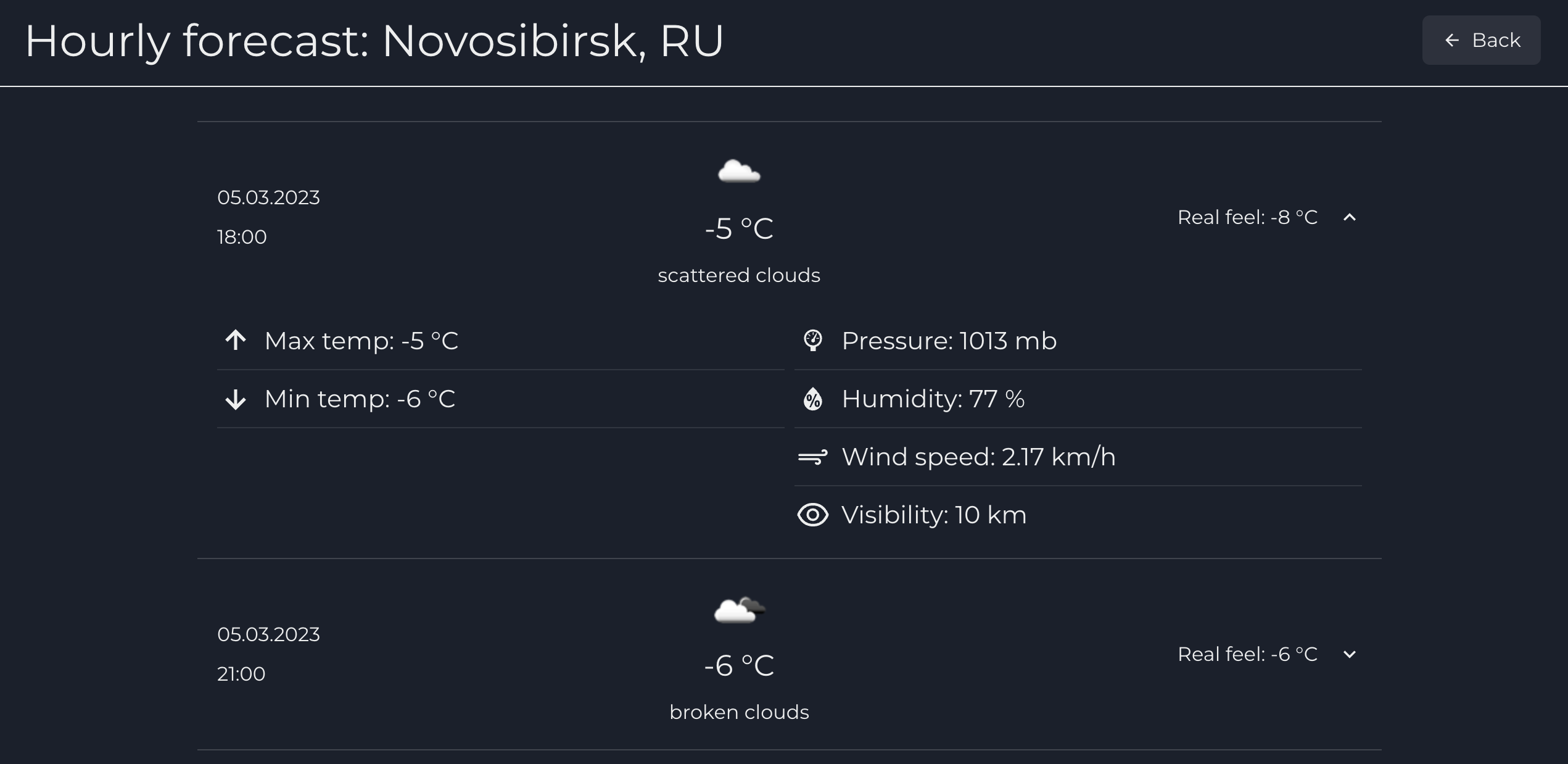 - Побочная страница, отображающая почасовой прогноз погоды для указанного города. При инициализации, страница берет город из URL.