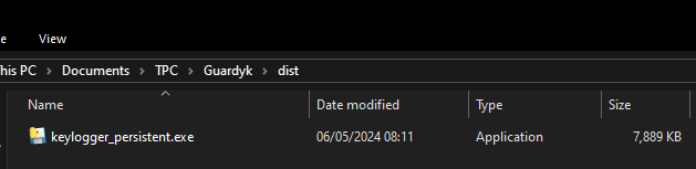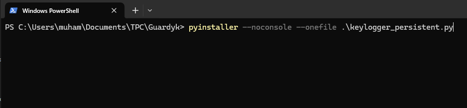 Again, this command, using PyInstaller, converts the Python script keylogger_persistence.py into a standalone executable file (--onefile), configured to run without displaying a console window when executed (--noconsole).