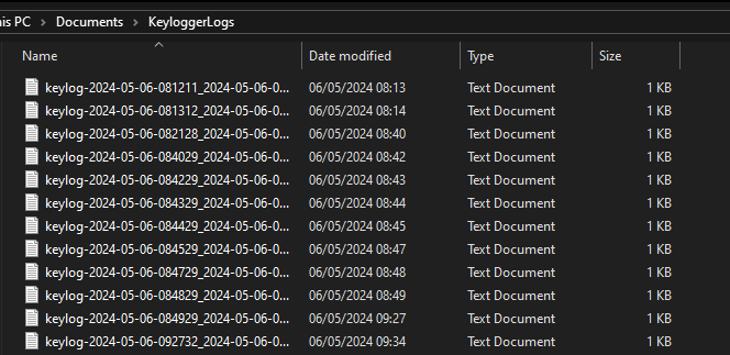 Please know that for testing purposes, we used the txt format to record the keystrokes. In a real-world scenario, you would want to use email reporting to receive the keystrokes. You can simply run the program with report_method="email" instead.