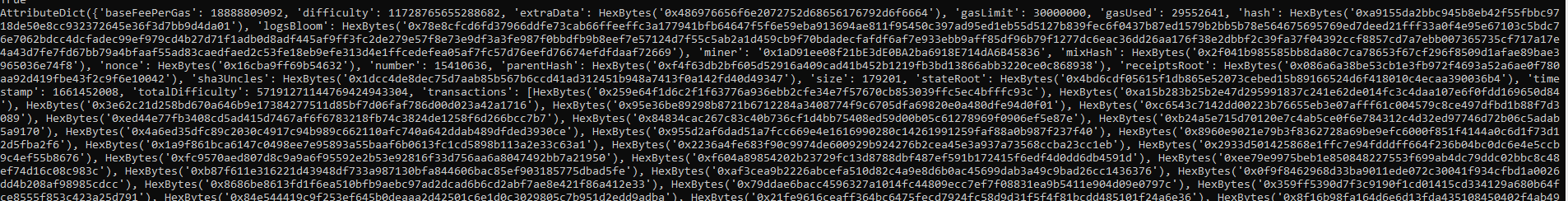 AttributeDict({'baseFeePerGas': 18888809092, 'difficulty': 11728765655288682, 'extraData': HexBytes('0x486976656f6e2072752d68656176792d6f6664'), 'gasLimit': 30000000, 'gasUsed': 29552641, 'hash': HexBytes('0xa9155da2bbc945b8eb42f55fbbc9718de50e8cc932372645e36f3d7bb9d4da01'), 'logsBloom': ………………………………….. 'transactionsRoot': HexBytes('0x07b76aa5b8948e19e1f92b268e0545069a9924e8625605c1b4ade775ee99f465'), 'uncles': []})